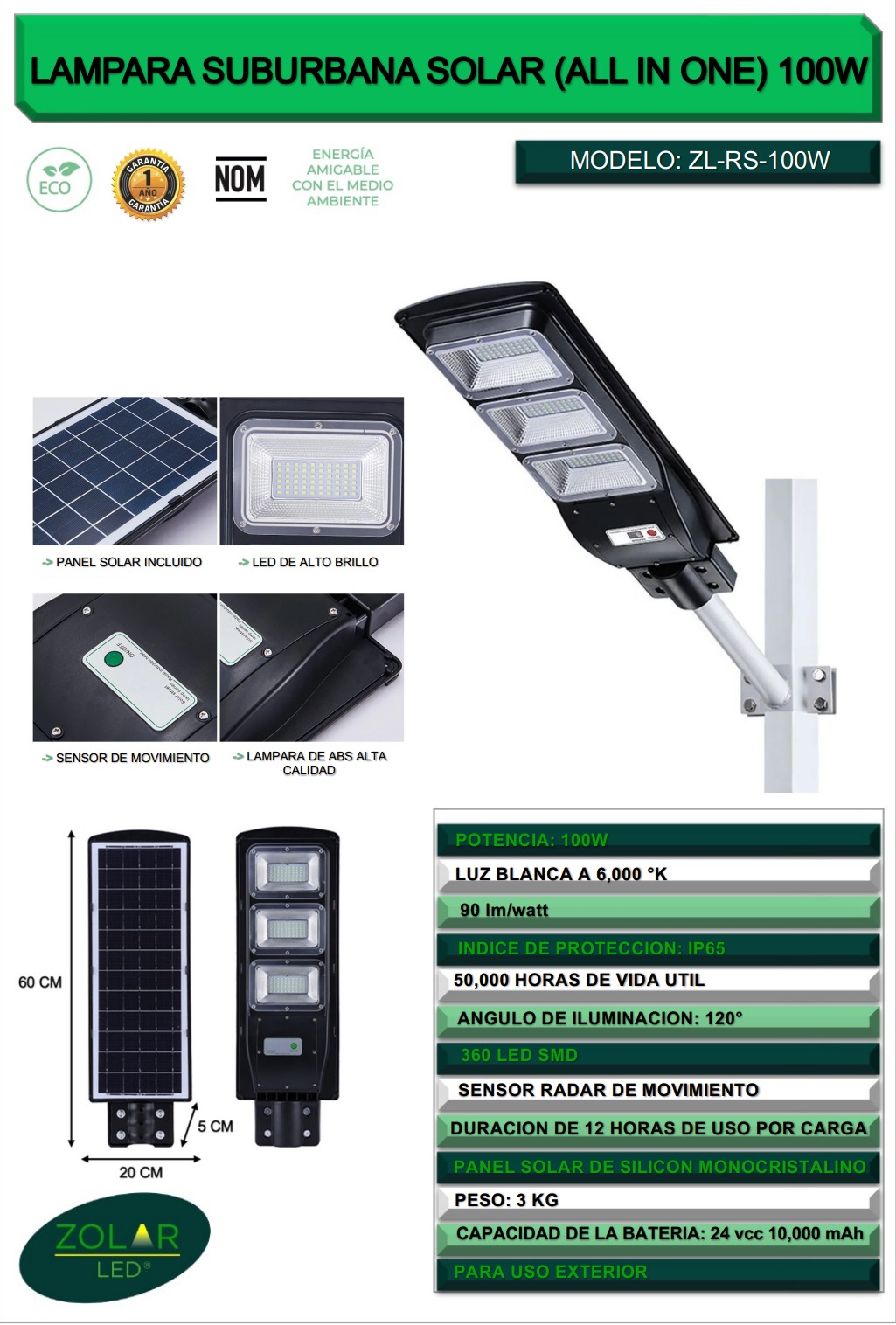 Lámpara Suburbana Solar<br> ZL-RS-100W (incluye Tubo)